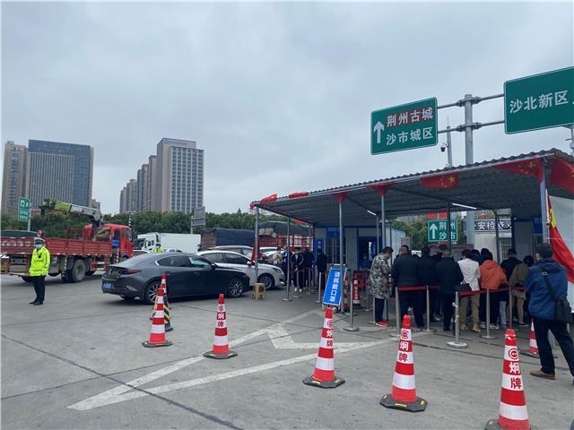 在荊州中高速公路進出口的疫情防控檢測點,南來北往的駕乘人員正在工作人員指引下進行信息登記、查驗落地核酸,交警在車流中指揮通行,一刻不停。