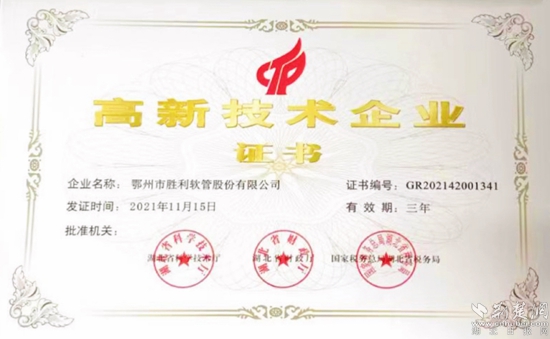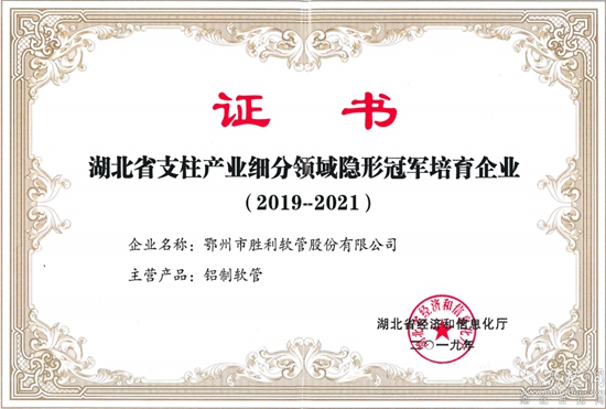 2019年,勝利軟管獲得湖北省支柱產(chǎn)業(yè)細(xì)分領(lǐng)域隱形冠軍培育企業(yè);2021年,勝利軟管獲得“湖北省高新技術(shù)企業(yè)”稱號;2022年,勝利軟管成功入圍湖北省第四批專精特新“小巨人”企業(yè)。
