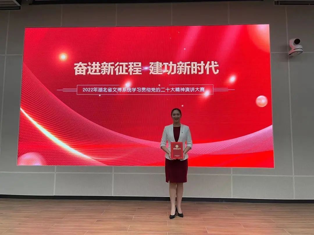 為慶祝黨的二十大勝利召開,進一步激發(fā)全省博物館、紀念館黨員群眾立足崗位、奮發(fā)有為、不忘初心、砥礪奮進的干事創(chuàng)業(yè)熱情,營造學(xué)習(xí)貫徹黨的二十大精神的良好氛圍,湖北省博物館協(xié)會組織開展了“奮進新征程 建功新時代”主題演講比賽,荊州博物館講解員在比賽中榮獲佳績。