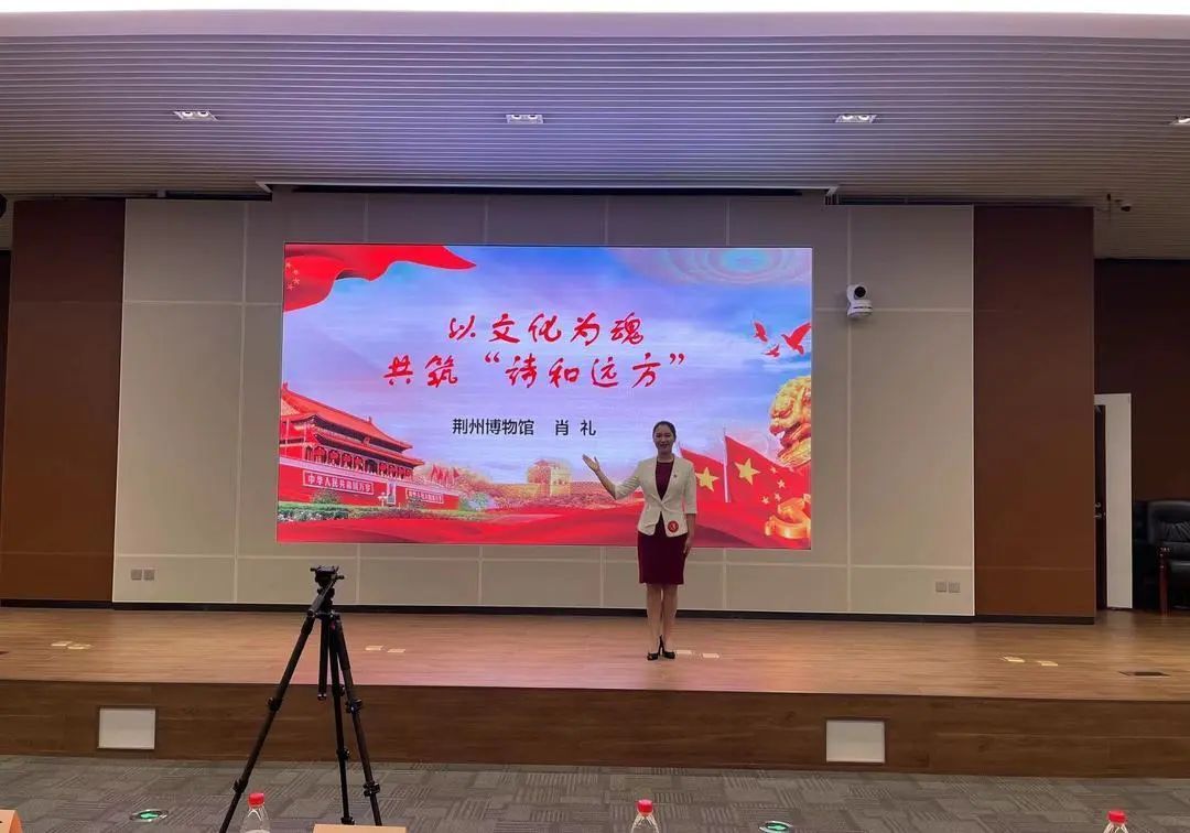 決賽于11月7日上午舉行,荊州博物館講解員肖禮進行了題目為《以文化為魂,共筑“詩和遠方”》的演講,演講內(nèi)容將黨的二十大精神和宣教工作相結(jié)合,歌頌了中國共產(chǎn)黨的創(chuàng)造精神、奮斗精神、初心精神、奉獻精神等,講述了新時代的文博工作者做好“文化傳承者”“講好中國故事,傳播好中國聲音”的決心和付出的努力,講出了文博人的心聲,最終榮獲“二等獎”的好成績。荊州博物館講解員代依佩、舒嘯、沈雪情榮獲三等獎。