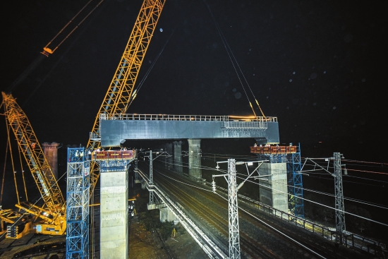 11月15日凌晨1時30分許,新建荊荊鐵路工程跨漢宜鐵路吊裝施工順利完成(見右圖),標志著荊荊鐵路全線施工難度最大的控制性工程如期推進,為荊荊鐵路后續(xù)提速架梁鋪軌創(chuàng)造了條件。