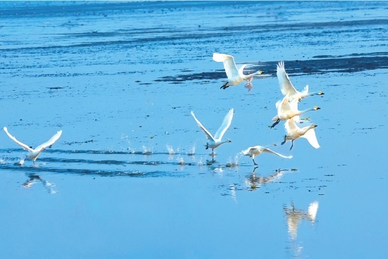 連日來(lái),在洪湖國(guó)家級(jí)自然保護(hù)區(qū),成群的小天鵝如約前來(lái)越冬。