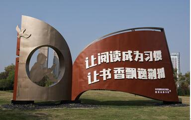 在荊州市圖書館新館前,景觀小品上“讓閱讀成為習慣,讓書香飄逸荊州”的標語醒目大氣,聚精會神讀書的小孩和白鴿象征著希望,整個景觀小品與圖書館的氣質(zhì)相得益彰,讓過往市民耳目一新;