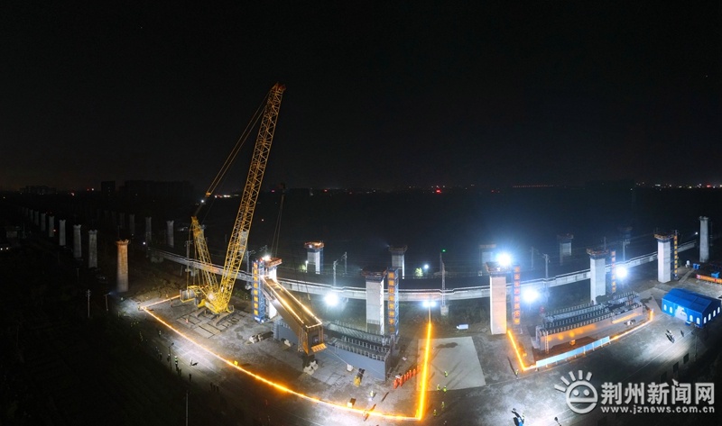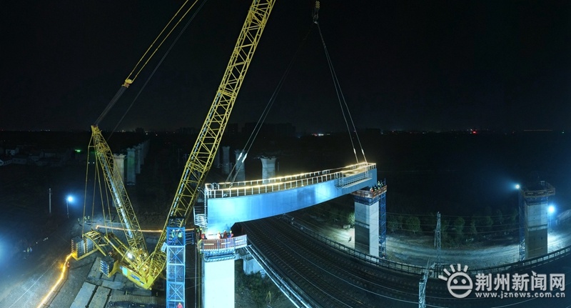 圖為11月22日凌晨,經(jīng)過5次封鎖要點施工,荊荊高鐵江漢運河2號特大橋5處跨漢宜鐵路鋼蓋梁施工全部完成。
