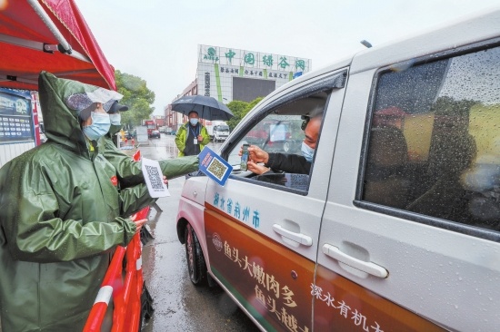 11月28日,荊州兩湖綠谷農(nóng)產(chǎn)品批發(fā)市場(chǎng)入口處,工作人員對(duì)進(jìn)場(chǎng)車輛上的駕乘人員進(jìn)行測(cè)溫、查驗(yàn)“兩碼”及車體消殺。