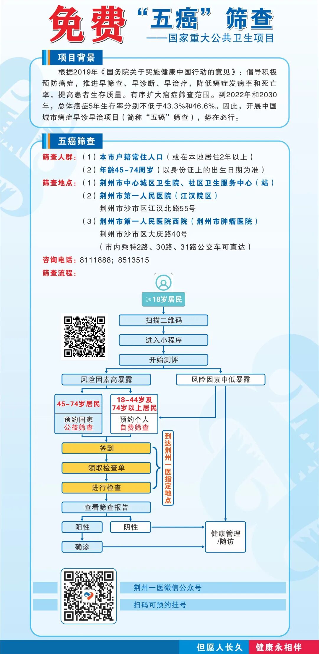 對(duì)于被評(píng)估為癌癥高危人群的居民,志愿者耐心指導(dǎo)其前往荊州市第一人民醫(yī)院西院、荊州市腫瘤醫(yī)院預(yù)約相關(guān)免費(fèi)檢查。如篩查出癌前病變、癌或疑似癌患者,將進(jìn)一步建議其到正規(guī)醫(yī)院進(jìn)行規(guī)范化診治。