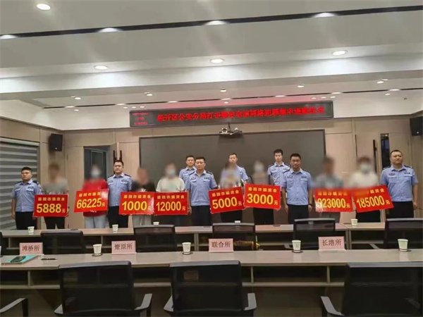 8月11日晚,荊州經(jīng)濟(jì)技術(shù)開發(fā)區(qū)公安分局院內(nèi),8名電詐受害人共領(lǐng)取警方追回的資金120萬元。11月21日至25日,沙市區(qū)公安分局觀音垱派出所民警奔赴山東多地,抓獲4人,為電詐受害人追回?fù)p失。