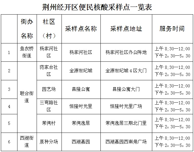 荊州經(jīng)開區(qū)發(fā)布關(guān)于進(jìn)一步優(yōu)化便民核酸采樣點(diǎn)的公告。