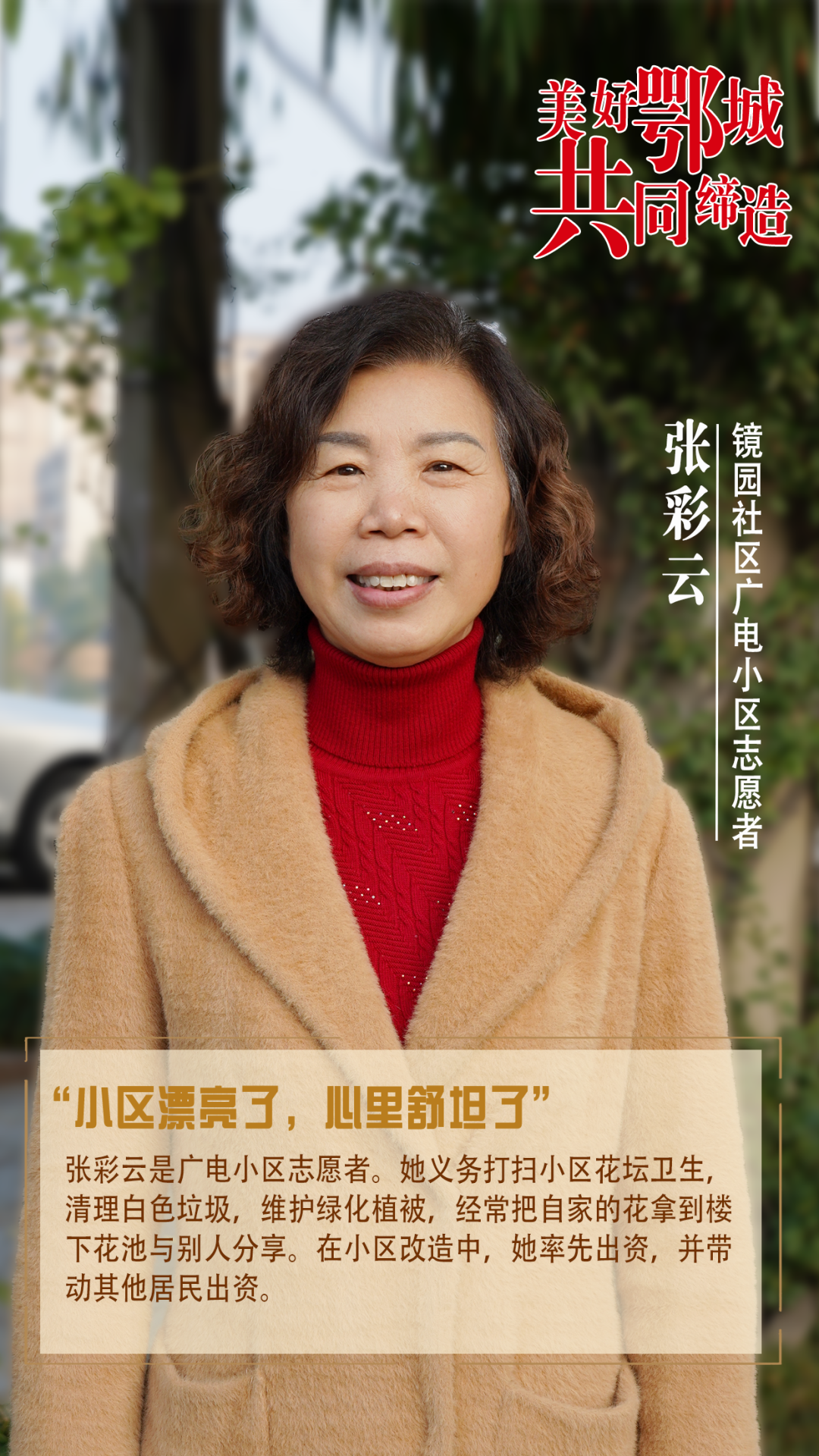 張彩云是廣電小區(qū)志愿者。她義務(wù)打掃小區(qū)花壇衛(wèi)生,清理白色垃圾,維護(hù)綠化植被,經(jīng)常把自家的花拿到樓下花池與別人分享。在小區(qū)改造中,她率先出資,并帶動(dòng)其他居民出資。