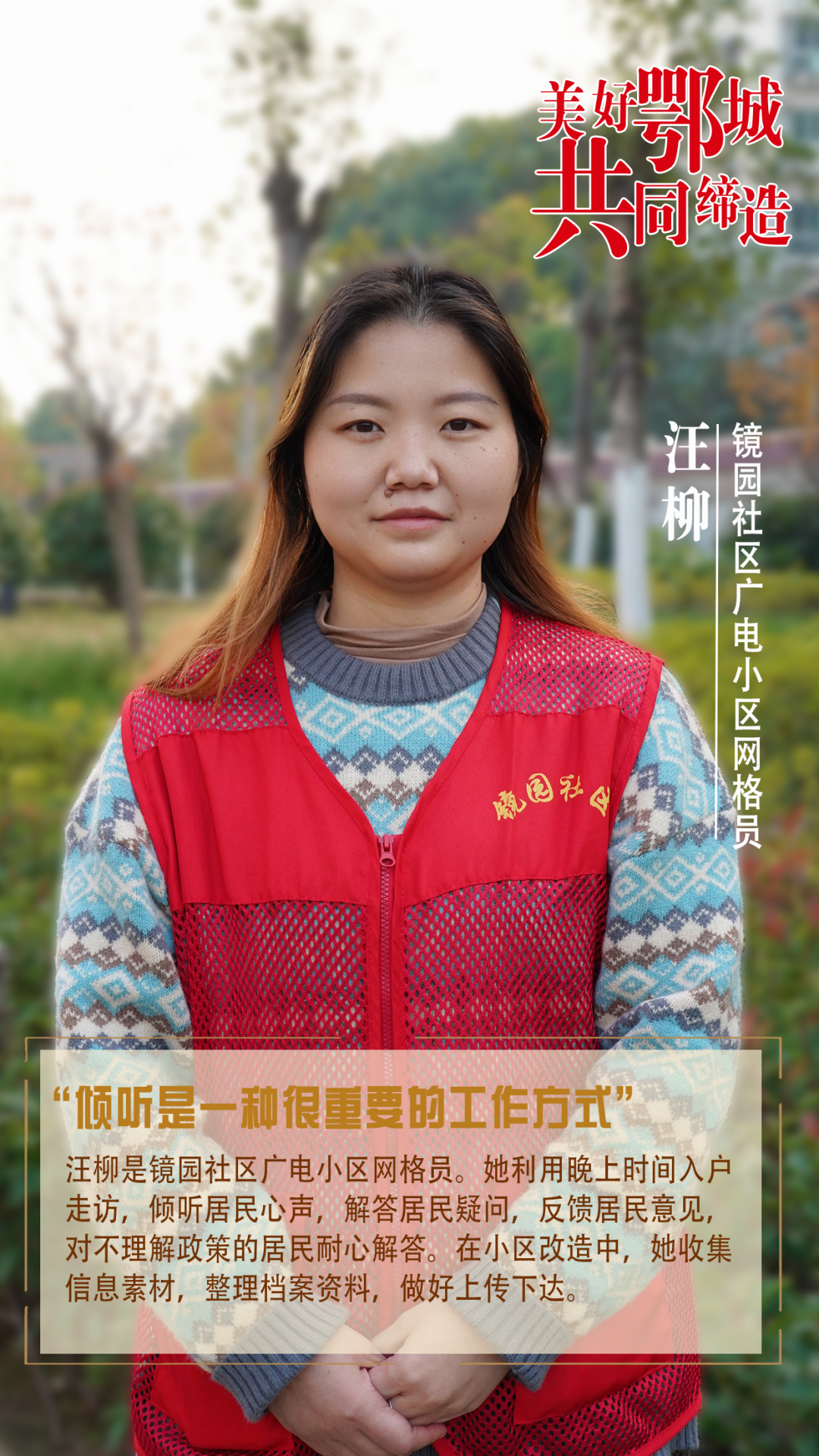 汪柳是鏡園社區(qū)廣電小區(qū)網(wǎng)格員。她利用晚上時(shí)間入戶走訪,傾聽居民心聲,解答居民疑問,反饋居民意見,對(duì)不理解政策的居民耐心解答。在小區(qū)改造中,她收集信息素材,整理檔案資料,做好上傳下達(dá)。