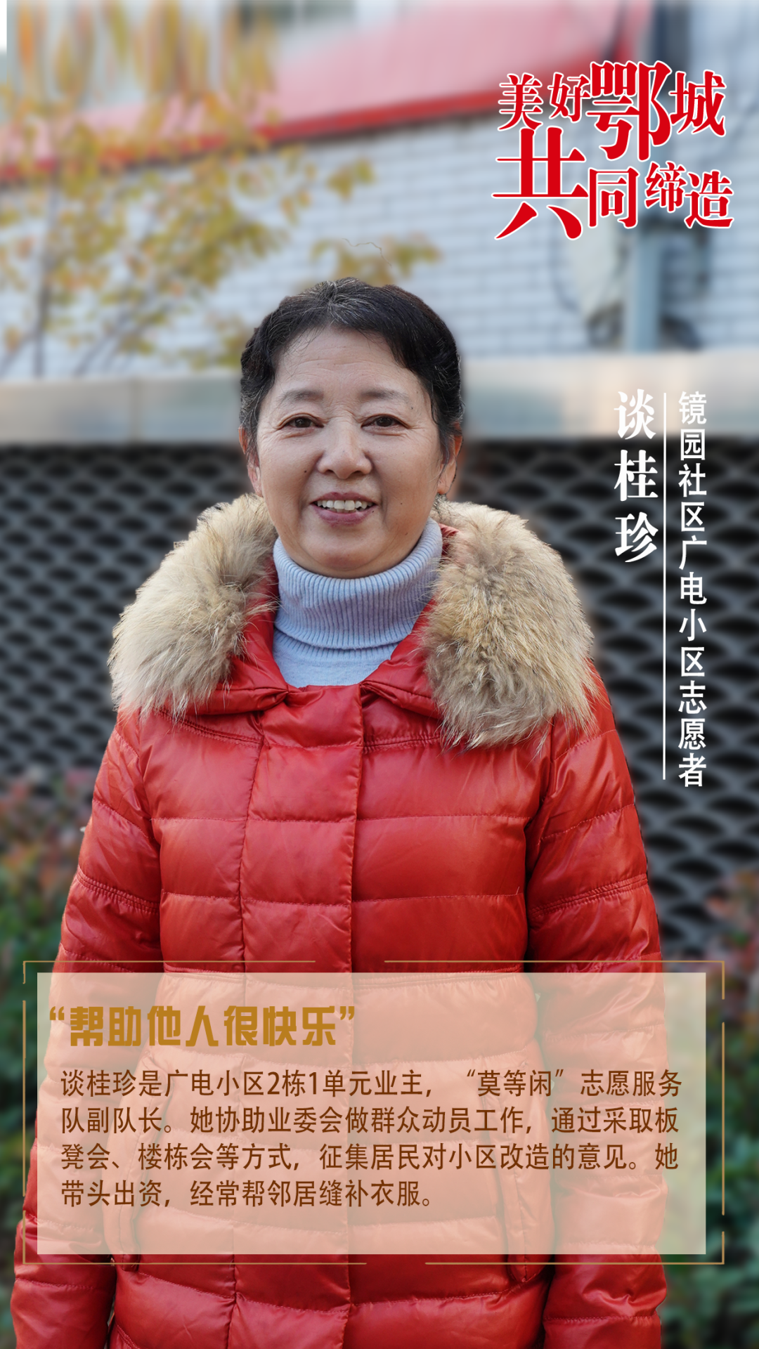 談桂珍是廣電小區(qū)2棟1單元業(yè)主,“莫等閑”志愿服務(wù)隊(duì)副隊(duì)長(zhǎng)。她協(xié)助業(yè)委會(huì)做群眾動(dòng)員工作,通過采取板凳會(huì)、樓棟會(huì)等方式,征集居民對(duì)小區(qū)改造的意見。她帶頭出資,經(jīng)常幫鄰居縫補(bǔ)衣服。