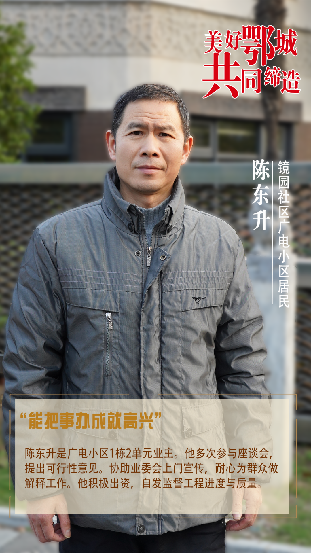 陳東升是廣電小區(qū)1棟2單元業(yè)主。他多次參與座談會(huì),提出可行性意見。協(xié)助業(yè)委會(huì)上門宣傳,耐心為群眾做解釋工作。他積極出資,自發(fā)監(jiān)督工程進(jìn)度與質(zhì)量。