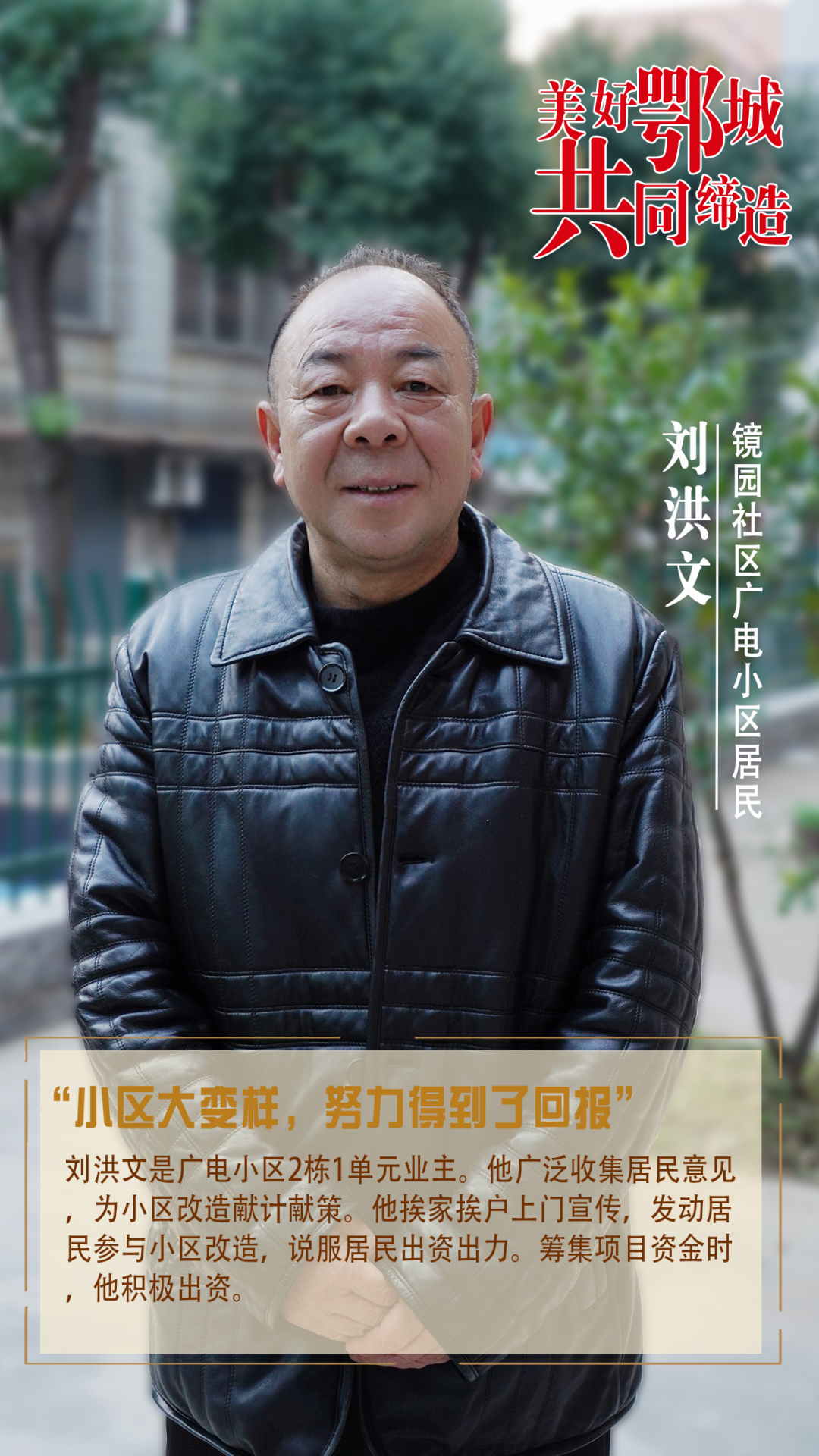 劉洪文是廣電小區(qū)2棟1單元業(yè)主。他廣泛收集居民意見,為小區(qū)改造獻(xiàn)計(jì)獻(xiàn)策。他挨家挨戶上門宣傳,發(fā)動(dòng)居民參與小區(qū)改造,說服居民出資出力?;I集項(xiàng)目資金時(shí),他積極出資。