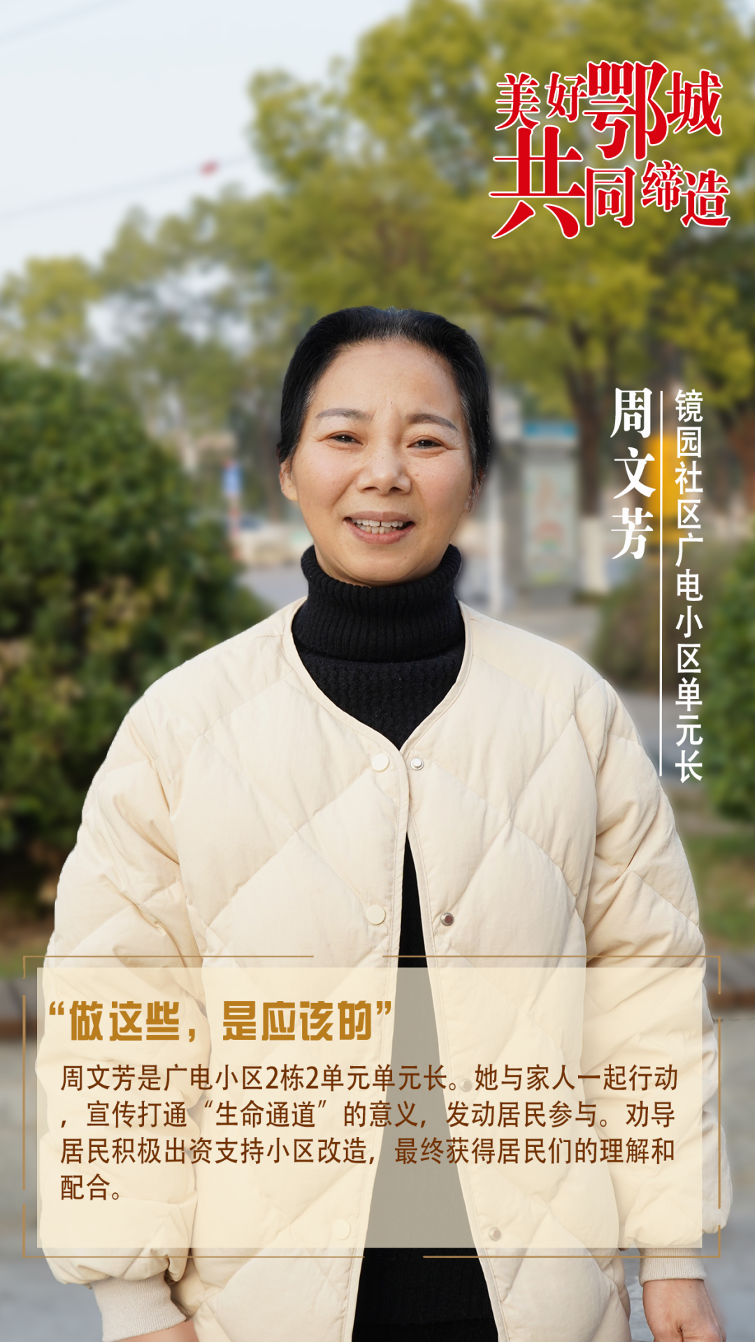 周文芳是廣電小區(qū)2棟2單元單元長(zhǎng)。她與家人一起行動(dòng),宣傳打通“生命通道”的意義,發(fā)動(dòng)居民參與。勸導(dǎo)居民積極出資支持小區(qū)改造,最終獲得居民們的理解和配合。