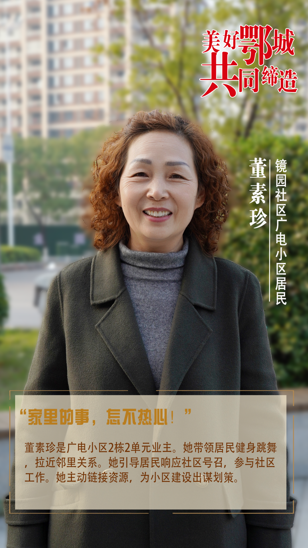 董素珍是廣電小區(qū)2棟2單元業(yè)主。她帶領(lǐng)居民健身跳舞,拉近鄰里關(guān)系。她引導(dǎo)居民響應(yīng)社區(qū)號(hào)召,參與社區(qū)工作。她主動(dòng)鏈接資源,為小區(qū)建設(shè)出謀劃策。