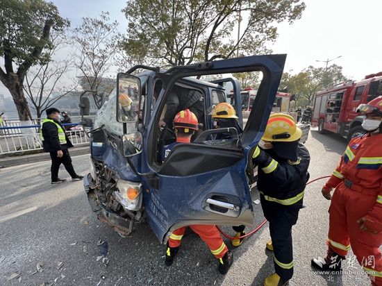 消防救援人員到達(dá)事故現(xiàn)場(chǎng)后,發(fā)現(xiàn)事故貨車的駕駛室因受猛烈撞擊發(fā)生變形,車門無法打開,駕駛室內(nèi)困有一名司機(jī),其精神狀況良好。