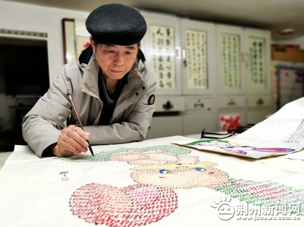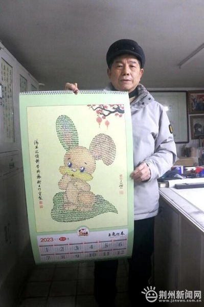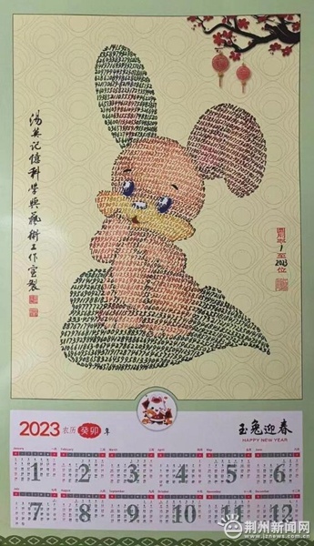 荊州新聞網(wǎng)消息(記者王默)2023年農(nóng)歷癸卯新年前夕,世界記憶奇人、圓周率構成藝術創(chuàng)始人湯英先生,在湖北荊州再次創(chuàng)作出圓周率書畫生肖新年掛歷——《玉兔迎春》,這是他連續(xù)第七年創(chuàng)作這種獨樹一幟、神奇新穎的新年掛歷。湯英向記者介紹《玉兔迎春》掛歷的寓意:在全國人民共同抗疫的情形下,用圓周率小數(shù)點后的2023個數(shù)字描畫而成的機敏玉兔,跳躍在一片綠葉上,春回大地,“數(shù)字玉兔”帶著對生命、對未來的憧憬,這是一種向上的力量,展示迎接春天的生命活力。