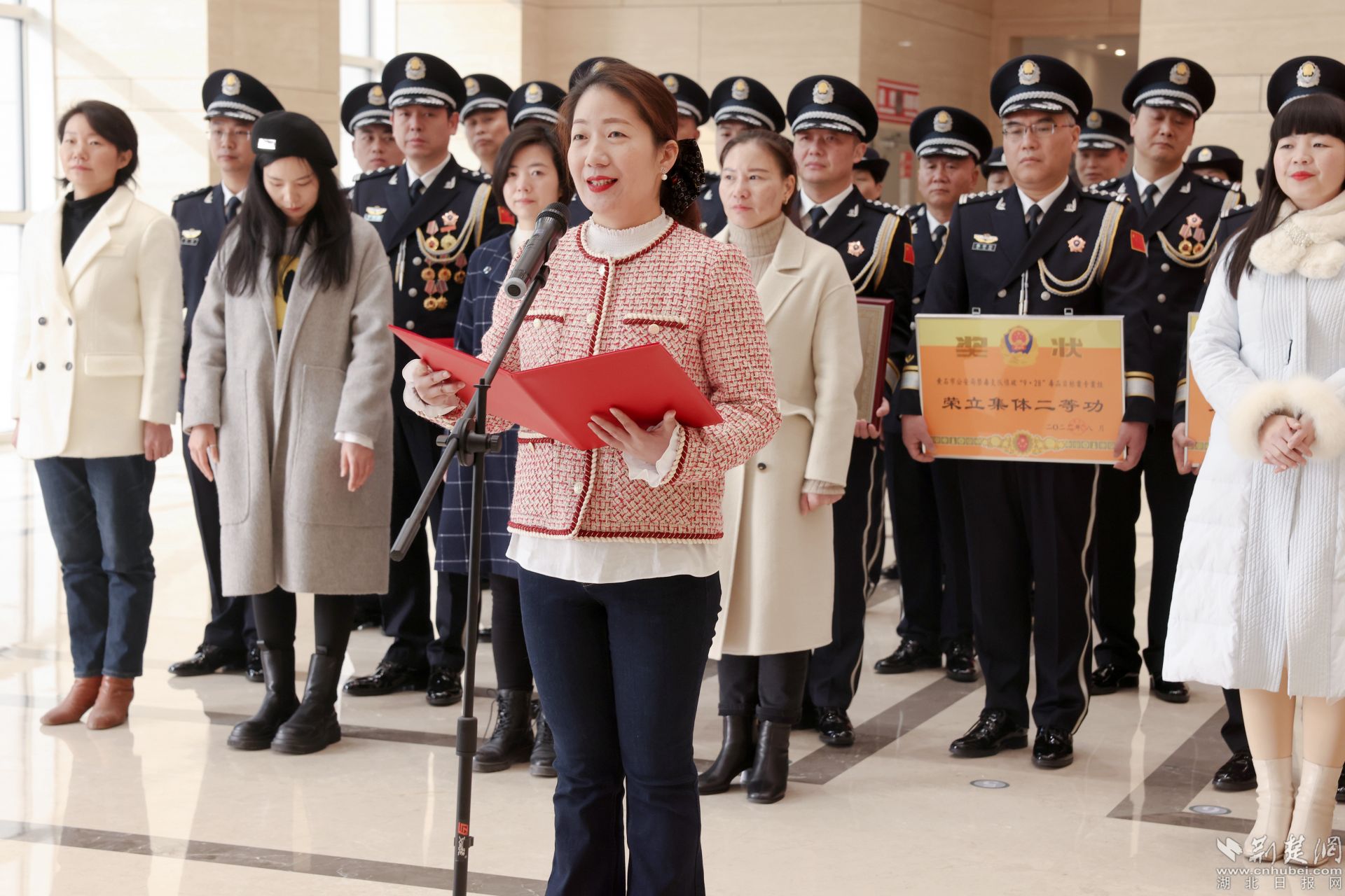公安局黨委副書記、副局長(zhǎng)牟波為榮記集體二等功代表頒獎(jiǎng)。通訊員 供圖
