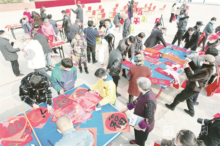 在皂市鎮(zhèn)文化館門前廣場(chǎng)上,黨的二十大精神文藝宣講剛一結(jié)束,送春聯(lián)活動(dòng)拉開(kāi)帷幕。來(lái)自市美術(shù)家協(xié)會(huì)、書(shū)法家協(xié)會(huì)、書(shū)畫(huà)研究會(huì)的書(shū)法愛(ài)好者現(xiàn)場(chǎng)揮毫,免費(fèi)書(shū)寫(xiě)贈(zèng)送春聯(lián)和“?!弊?,吸引眾多群眾參與。乒乓球臺(tái)、長(zhǎng)條桌上鋪滿了春聯(lián),將廣場(chǎng)烘托得格外火熱和喜慶(如圖)。