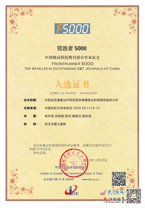 日前,科技部中國科技信息研究所發(fā)布了2021年度“領(lǐng)跑者5000 ——中國精品科技期刊頂尖學術(shù)論文(F5000)”入選名單。武漢市第九醫(yī)院研究論文《中藥連花清瘟治療新型冠狀病毒感染的肺炎回顧性臨床分析》(姚開濤,劉明瑜,李欣,黃繼漢,蔡宏斌)成功入選,體現(xiàn)了該研究成果在國內(nèi)的高影響力和學術(shù)價值。