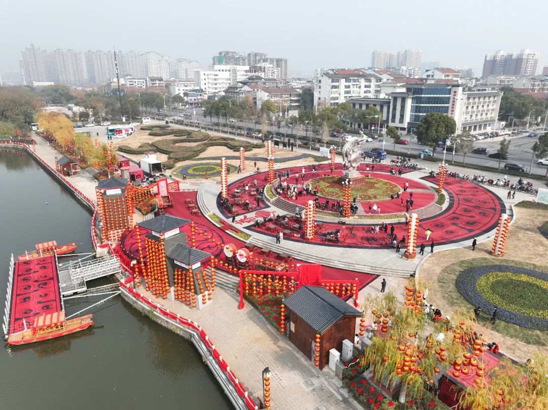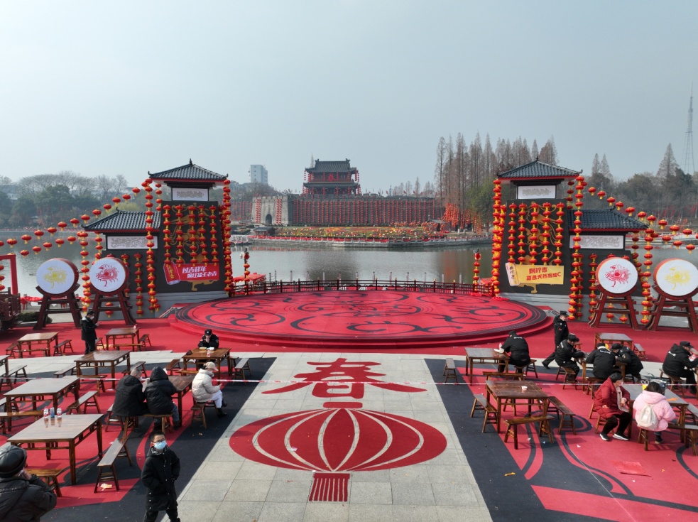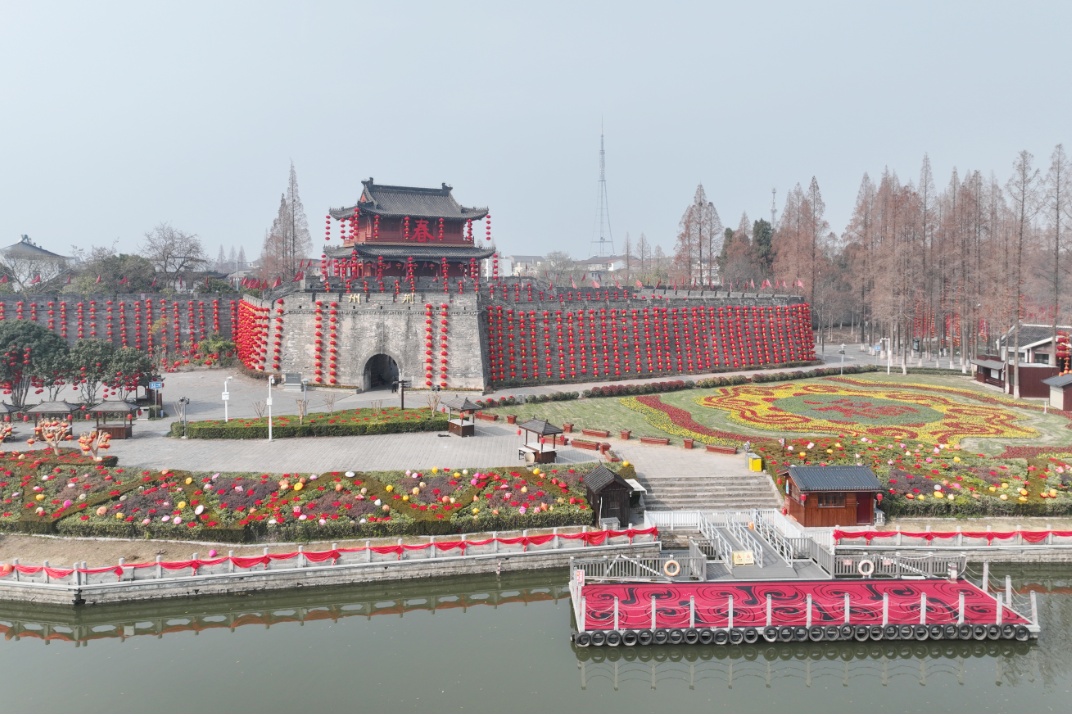 護(hù)城河畔方圓138畝的“荊風(fēng)楚韻”——16棟仿古建筑沿著護(hù)城河?xùn)|南岸逶迤排開,戰(zhàn)鼓藝術(shù)墻,水景赤兔馬等景觀小品穿插其間,形成獨(dú)具韻味的三國主題街區(qū)。
