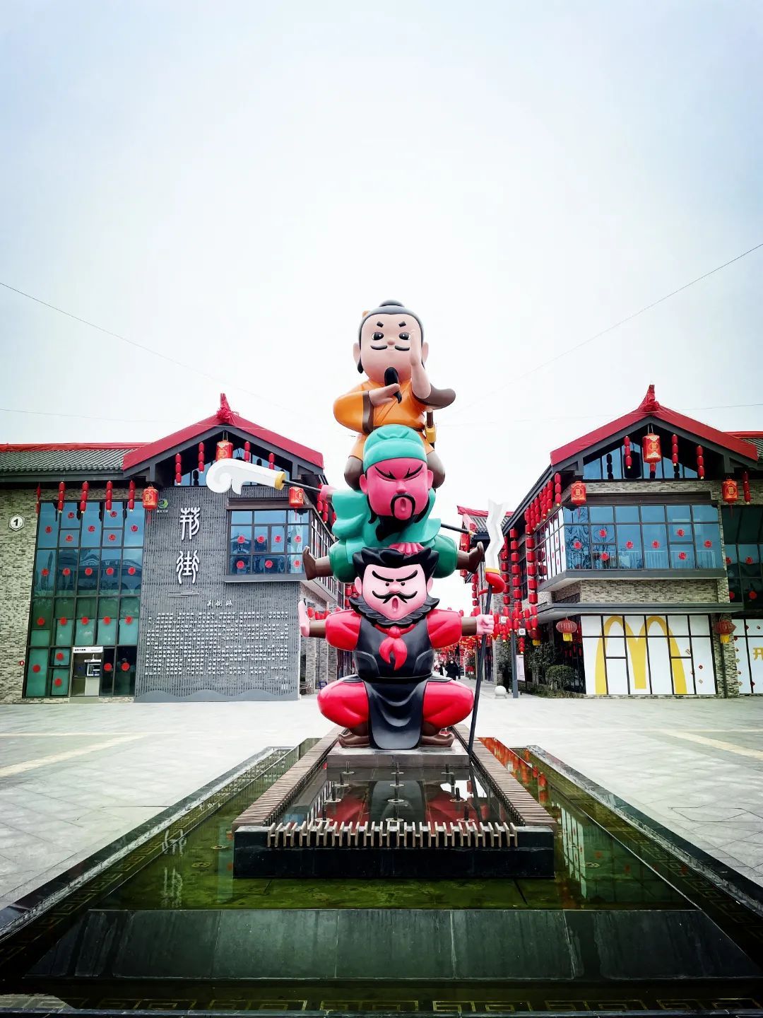 荊街大門口,Q版的劉關(guān)張正“疊羅漢”熱情歡迎你,話不多說,此處必有N張個(gè)性合影。