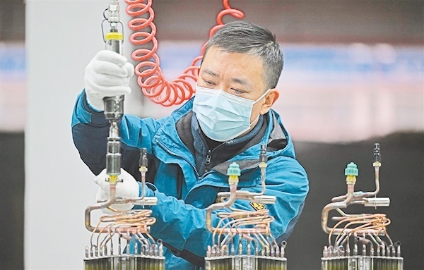 1月17日,荊州湖北美的樓宇科技有限公司新投產的生產車間內一派火熱繁忙景象,員工們正在緊張有序地裝配中央空調。(湖北日報全媒記者 劉曙松 通訊員 周櫟 攝)