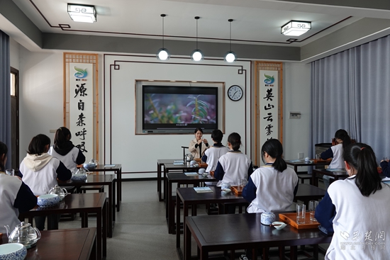 英山地處大別山南麓,是湖北省綠茶主產(chǎn)區(qū)之一。據(jù)悉,英山一中的每位學(xué)生在校期間要完成6個(gè)課時(shí)的茶藝課程,其中3節(jié)課用來(lái)學(xué)習(xí)理論知識(shí),包括茶的起源、分類、中國(guó)茶文化,以及基本的茶藝禮儀,另3節(jié)課則進(jìn)行全套茶具實(shí)操訓(xùn)練,完成一個(gè)完整的茶藝表演。