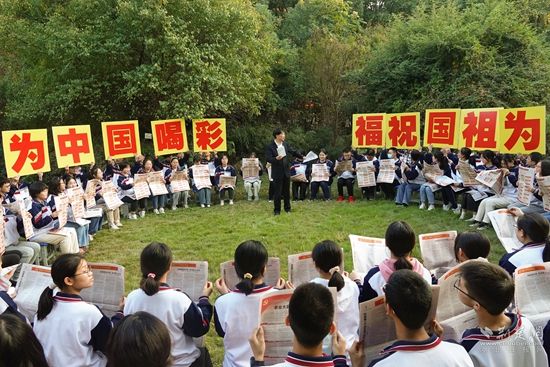 同學(xué)們手舉“踔厲奮發(fā) 砥礪前行”“為中國(guó)喝彩 為祖國(guó)祝?!钡葮?biāo)牌互動(dòng)熱烈。