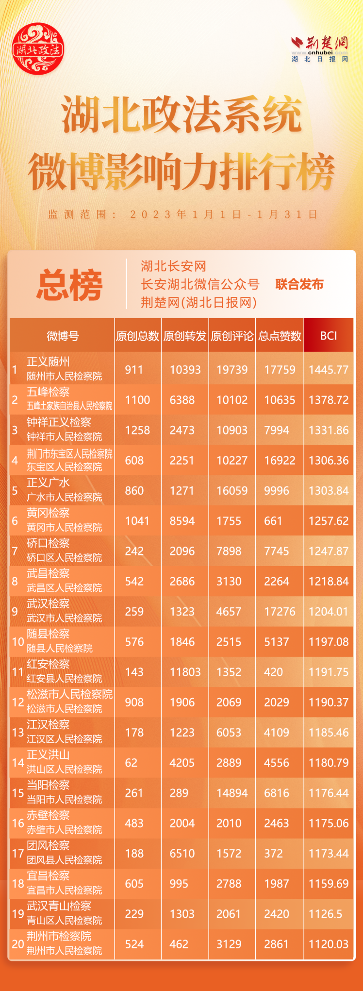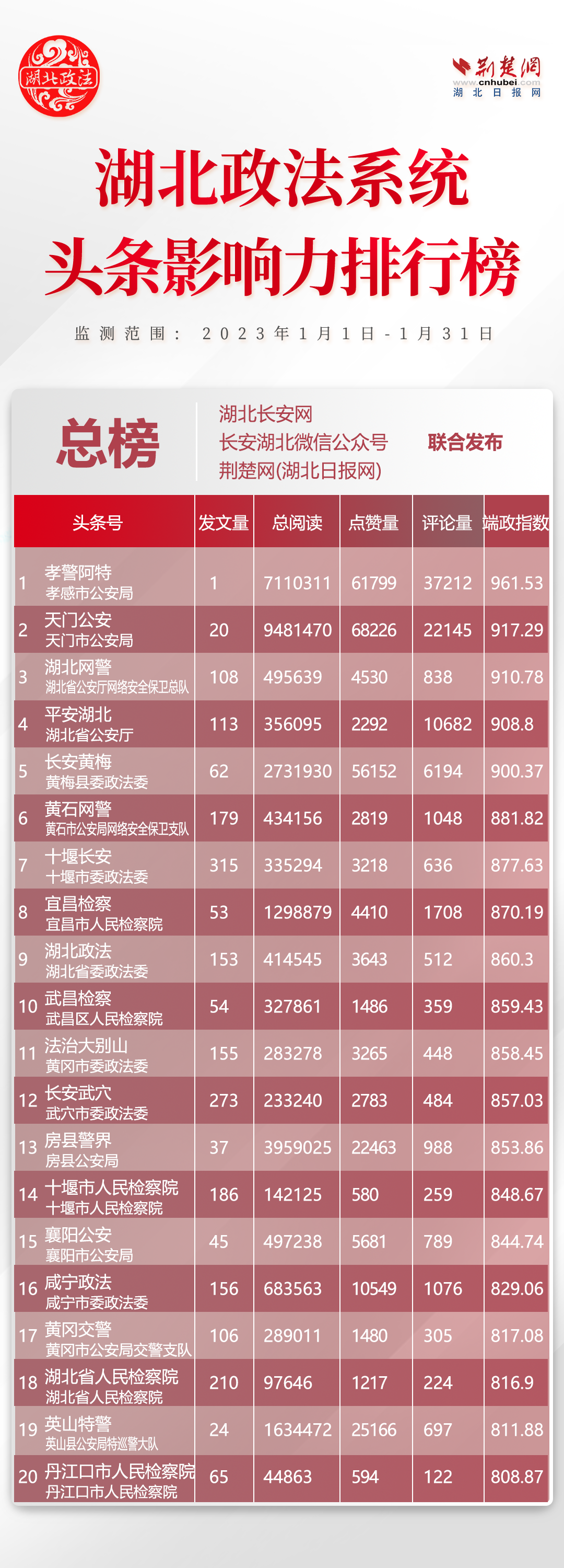 湖北政法系統(tǒng)681個(gè)頭條帳號(hào)參加評(píng)選,其中政法委系統(tǒng)123個(gè)、法院系統(tǒng)128個(gè)、檢察系統(tǒng)130個(gè)、公安系統(tǒng)141個(gè)、司法系統(tǒng)159個(gè)?!伴L安黃梅”、“法治大別山”、“長安武穴”、“黃岡交警”、“英山特警”5家單位強(qiáng)勢(shì)上榜,分別排名第5位、第11位、12位、17位、19位。