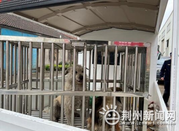 在荊州區(qū)城南高新園御河社區(qū),執(zhí)法人員攜帶捕犬網(wǎng)、防咬手套等捕犬工具,在大街小巷搜尋,最終在郢都路御河工貿(mào)園區(qū)將兩只流浪犬收容進(jìn)籠。