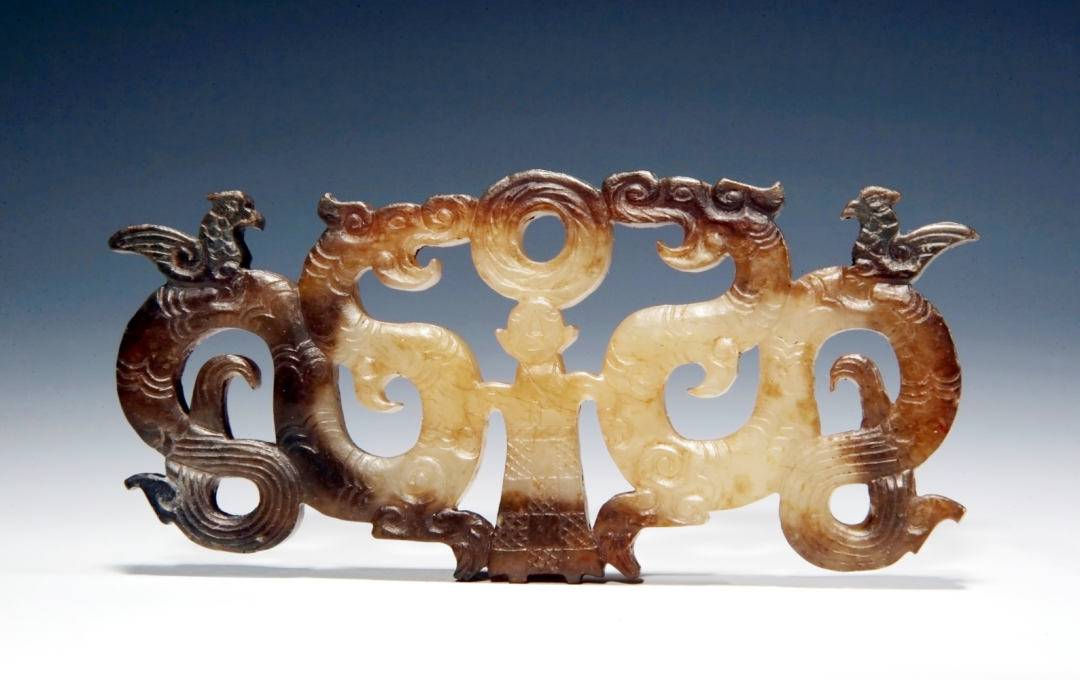 藏品簡介:由一人、二龍、二鳳組成。人著網(wǎng)格紋右衽深衣居中,頭頂圓形璧,雙臂張開各執(zhí)一龍。二龍相對,龍身虬曲,龍背各棲一鳳鳥。造型獨(dú)特,寓意深刻,渾然天成,巧奪天工。
