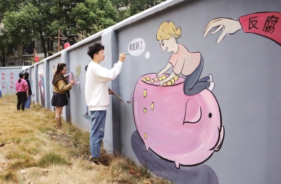 日前,在沙市區(qū)勝利街道蛇入山社區(qū)生資小區(qū),專業(yè)繪畫(huà)師正在創(chuàng)作廉政漫畫(huà)。