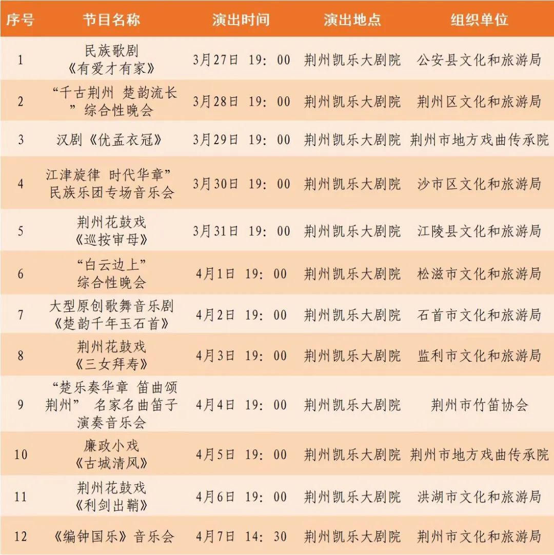 傳統(tǒng)劇目演出5場(chǎng),分別為漢劇《優(yōu)孟衣冠》、歌劇《有愛(ài)才有家》、荊州花鼓戲《利劍出鞘》《三女拜壽》《巡按審母》;
