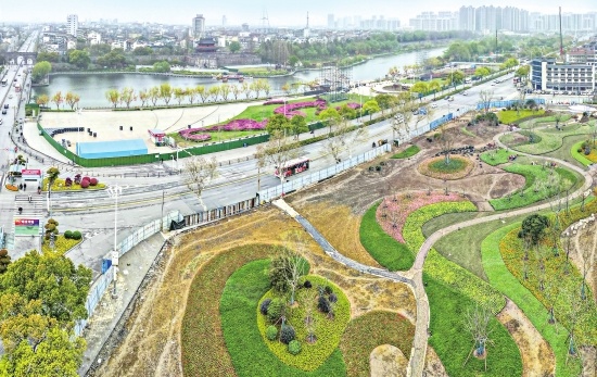 3月22日,航拍荊州古城歷史文化旅游區(qū)東門(mén)賓陽(yáng)樓景區(qū)護(hù)城河?xùn)|面新建中的軸承廠公園,一步一景。該公園面積約11700平方米,主要由入口廣場(chǎng)鋪裝、園路、花海及花境組成。其中,花海面積約7000平方米,花境面積約500平方米。景觀部分采用開(kāi)放式綠地自由組團(tuán)造景,楚風(fēng)楚韻與現(xiàn)代園林相互交融。