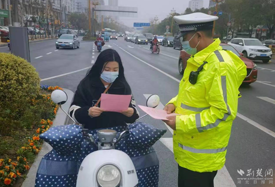 荊楚網(湖北日報網)訊(通訊員肖杰、王睿)“您好,您這樣不戴安全頭盔騎行電動車非常危險……”3月21日清晨,麻城市公安局交警大隊輔警李彬正在雨中值勤,向過往車輛散發(fā)文明交通宣傳單,并對駕乘電動車不戴安全頭盔、逆向行駛、違法載人、隨意抄近路等交通違法行為進行勸導,提醒市民時刻謹記交通規(guī)則,安全文明出行。