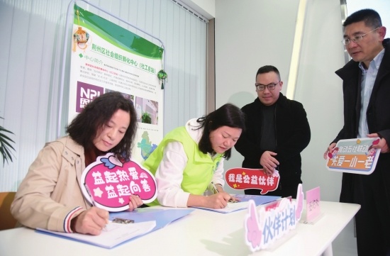 日前,在荊州區(qū)社會(huì)工作宣傳周啟動(dòng)儀式暨首屆公益“伙伴計(jì)劃”簽約儀式上,愛心單位代表現(xiàn)場(chǎng)簽訂公益合作協(xié)議,認(rèn)領(lǐng)志愿服務(wù)項(xiàng)目。