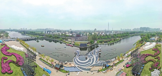 3月28日,航拍位于荊州古城歷史文化旅游區(qū)東門賓陽樓景區(qū)的新建大型水上舞臺,已展現(xiàn)出“鳳鳥騰云,翱翔九天”的恢弘氣勢。