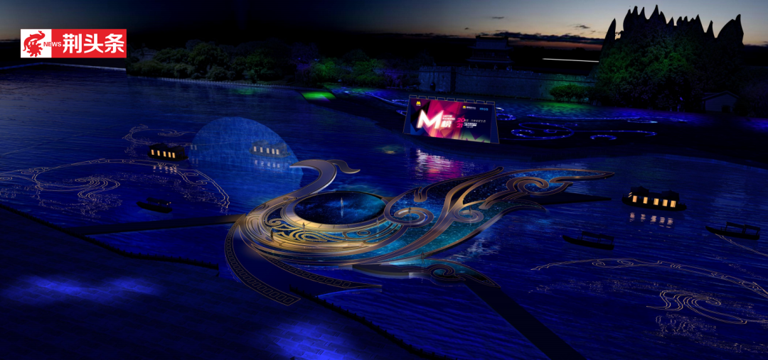 整個水上舞臺在護城河上搭建完成,舞臺表面由LED大屏全覆蓋,通過屏幕里面視覺元素的體現(xiàn)與變化。未來,在舞臺上的這只金鳳可以呈現(xiàn)出多姿多彩,不同的狀態(tài)和韻味,淋漓盡致地展現(xiàn)出楚文化的浪漫與神秘,向廣大市民游客呈現(xiàn)一幅浪漫詩意、如夢似幻的楚文化畫卷。