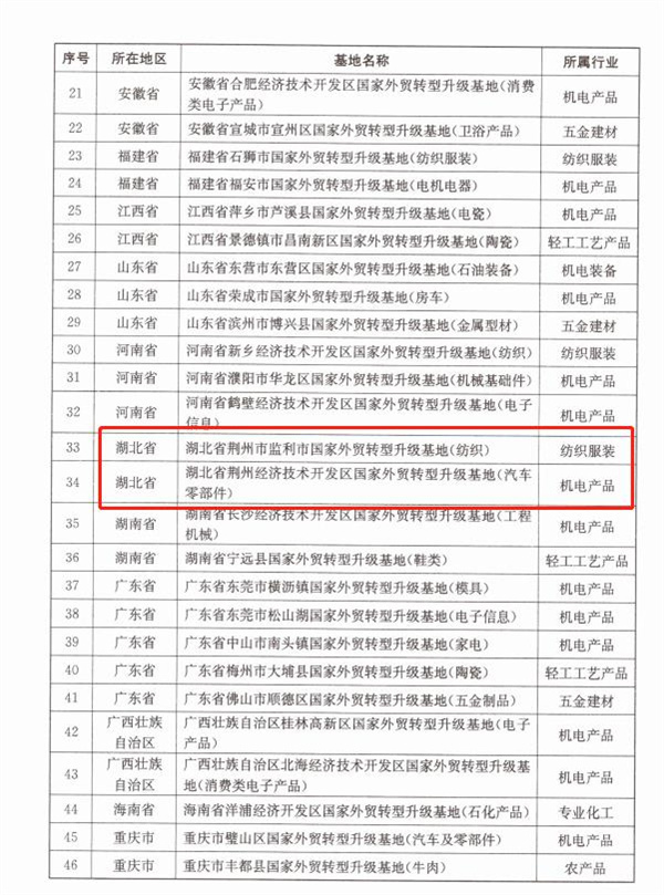 為積極推進(jìn)國(guó)家外貿(mào)轉(zhuǎn)型升級(jí)基地建設(shè),日前,商務(wù)部公布通過(guò)2022年國(guó)家外貿(mào)轉(zhuǎn)型升級(jí)基地考核的名單,共66個(gè)基地上榜。其中,湖北省荊州市監(jiān)利市國(guó)家外貿(mào)轉(zhuǎn)型升級(jí)基地(紡織)、湖北省荊州經(jīng)濟(jì)技術(shù)開發(fā)區(qū)國(guó)家外貿(mào)轉(zhuǎn)型升級(jí)基地(汽車零部件)名列榜單,荊州為此次湖北唯一上榜城市。