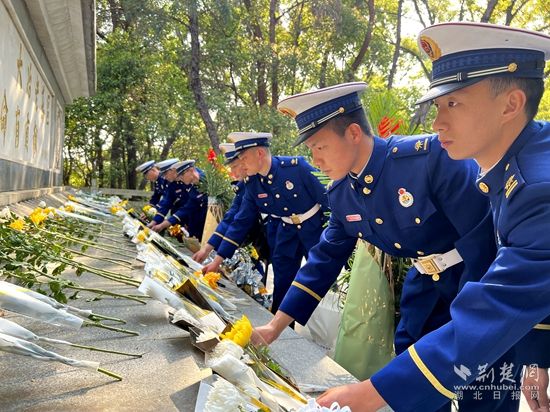在大冶市青龍山烈士紀(jì)念碑前,消防員向烈士敬獻鮮花,拂去烈士紀(jì)念碑上的輕塵并集體鞠躬默哀,深切表達(dá)對革命先烈的敬仰、哀思之情。全體消防救援人員嚴(yán)正肅穆,認(rèn)真聆聽每一句紅色故事、感悟每一個場景,從先烈們艱苦卓絕的凜然斗志和英雄慷慨的氣魄中,汲取新時代“火焰藍(lán)”的奮進力量。