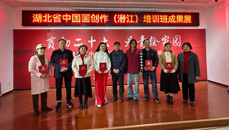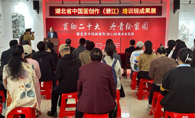 為弘揚(yáng)中華優(yōu)秀傳統(tǒng)文化,踐行文藝要“深入生活,扎根人民,服務(wù)大眾”的主旨要求,展示基層中國畫教學(xué)培訓(xùn)成果,4月1日,“貫徹二十大、丹青繪家園”湖北省中國畫創(chuàng)作(潛江)培訓(xùn)班成果展在潛江市美術(shù)館舉行。省文聯(lián)文學(xué)藝術(shù)院、湖北省國畫院、市委宣傳部、市文聯(lián)、市文旅局、市美術(shù)家協(xié)會、培訓(xùn)班學(xué)員30余人參加活動。