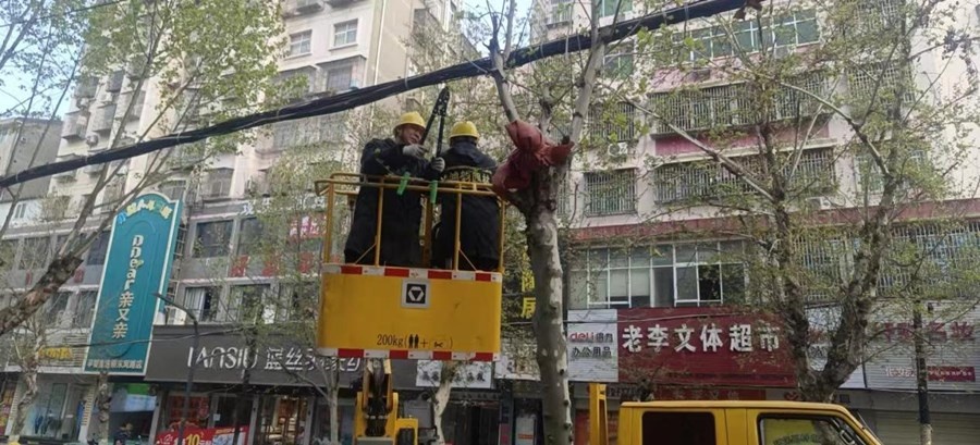 四月初,在東風(fēng)路新華書店前,兩位園林綠化工人站在高空作業(yè)車上,修剪交織在電纜里的樹枝。