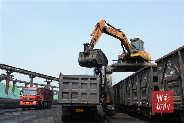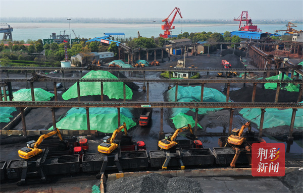 4月1日,荊州地鐵局鐵水聯(lián)運(yùn)旺港碼頭,機(jī)聲轟鳴,四臺(tái)抓機(jī)及十余輛翻斗車正在從火車箱里卸煤轉(zhuǎn)運(yùn)。