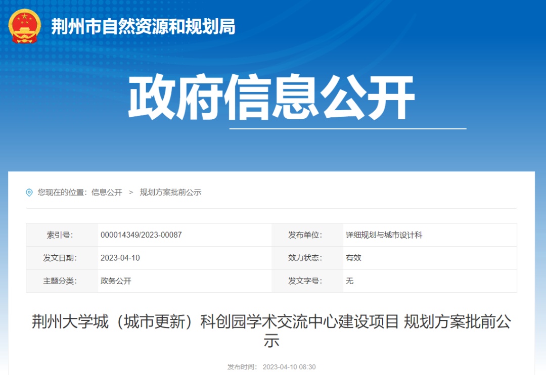 近日,荊州市自然資源和規(guī)劃局發(fā)布荊州大學(xué)城(城市更新)科創(chuàng)園學(xué)術(shù)交流中心建設(shè)項(xiàng)目,規(guī)劃方案批前公示。