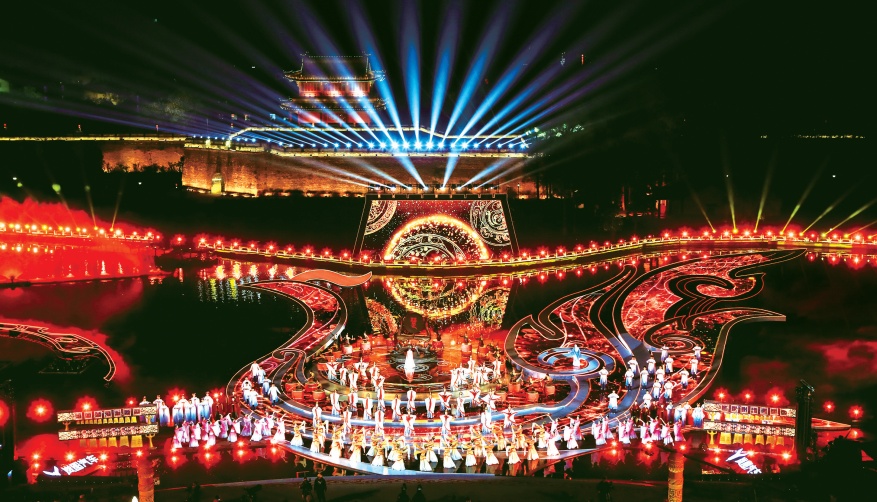 千年古城無疑是荊州最亮麗的名片,楚文化節(jié)舞臺(tái)以荊州古城為背景,在璀璨的燈光映射下,與夢(mèng)幻的舞臺(tái)交相輝映。
