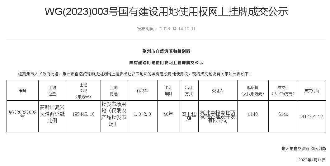 就在上周!荊州高新區(qū)又一地塊WG(2023)003號以6140萬元成功出讓!