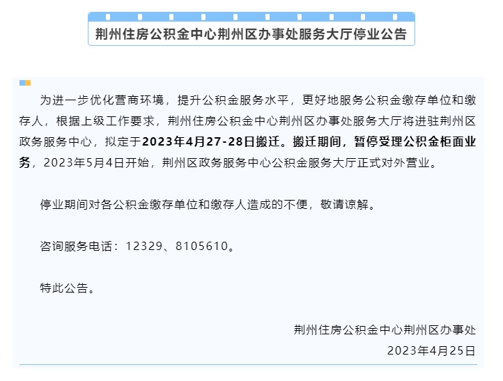 為進(jìn)一步優(yōu)化營商環(huán)境,提升公積金服務(wù)水平,更好地服務(wù)公積金繳存單位和繳存人,根據(jù)上級工作要求,荊州住房公積金中心荊州區(qū)辦事處服務(wù)大廳于2023年4月27日搬遷至荊州區(qū)政務(wù)服務(wù)中心,自2023年5月4日正式對外受理業(yè)務(wù),請各繳存單位和繳存人相互轉(zhuǎn)告。