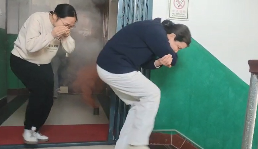 理論培訓(xùn)結(jié)束后,在一陣煙霧中,所有職工在引導(dǎo)員的指引下捂住口鼻按照指定路線逃生。隨后,在場職工進(jìn)行滅火器使用實(shí)操培訓(xùn),并逐一進(jìn)行滅火演練。