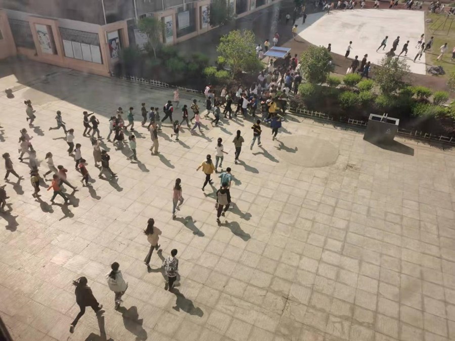 隨著校園廣播發(fā)出緊急疏散警報,各任課教師快速到達(dá)各樓梯口,各班主任迅速將學(xué)生組織在走廊排好隊(duì)形開始疏散;學(xué)生們用手護(hù)住頭部,有秩序的按既定路線撤離教室,快速疏散到安全地帶。整個過程組織有序、撤離迅速,演練達(dá)到了預(yù)期效果。